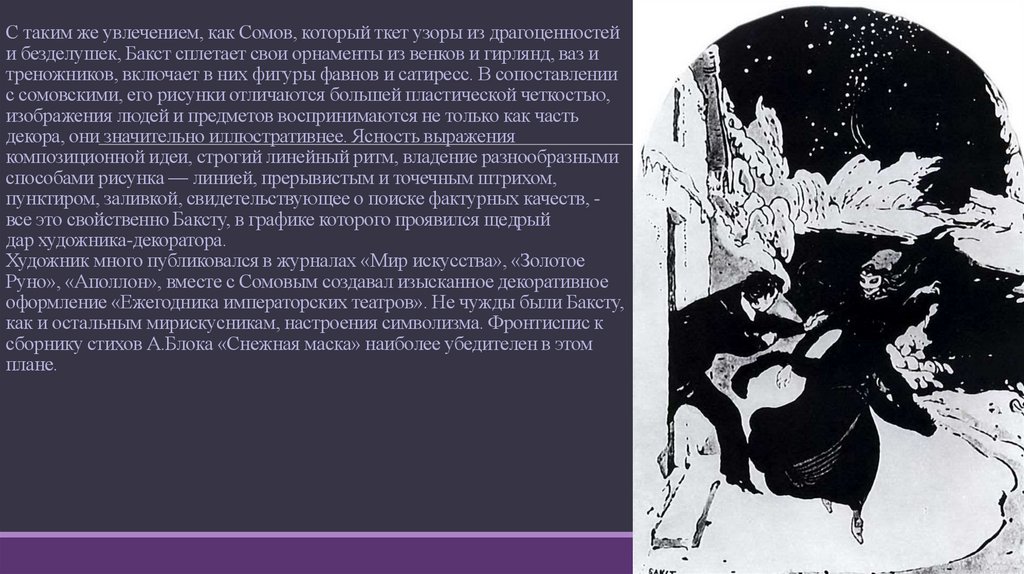 С таким же увлечением, как Сомов, который ткет узоры из драгоценностейи безделушек, Бакст сплетает свои орнаменты из венков и гирлянд, ваз и