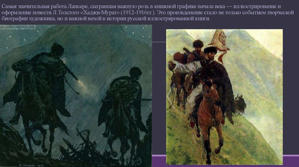 Самая значительная работа Лансере, сыгравшая важную роль в книжной графике начала века — иллюстрирование иоформление повести Л.Толстого «Хаджи-Мурат» (1912-1916гг.). Это произвденение стало не только событием творческой
