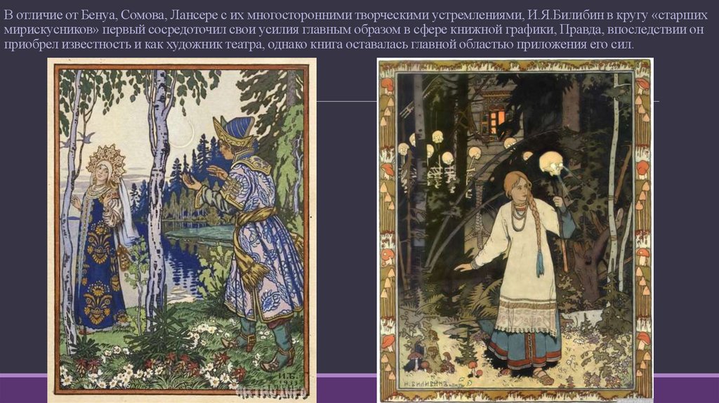 В отличие от Бенуа, Сомова, Лансере с их многосторонними творческими устремлениями, И.Я.Билибин в кругу «старшихмирискусников» первый сосредоточил свои усилия главным образом в сфере книжной графики, Правда, впоследствии он