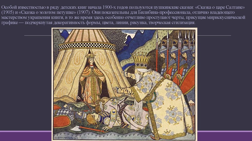 Особой известностью в ряду детских книг начала 1900-х годов пользуются пушкинские сказки: «Сказка о царе Салтане»(1905) и «Сказка о золотом петушке» (1907). Они показательны для Билибина-профессионала, отлично владеющего