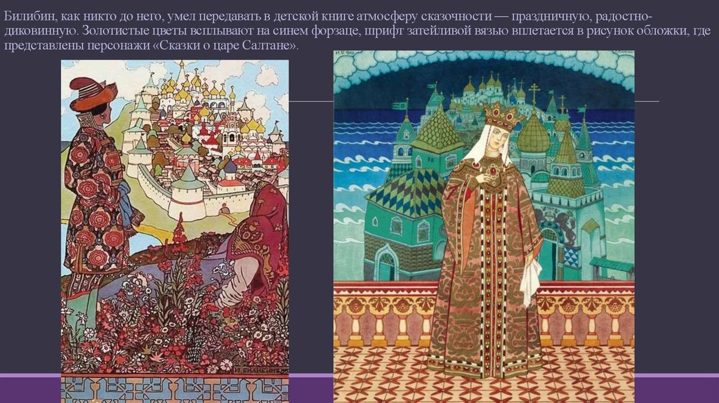 Билибин, как никто до него, умел передавать в детской книге атмосферу сказочности — праздничную, радостнодиковинную. Золотистые цветы всплывают на синем форзаце, шрифт затейливой вязью вплетается в рисунок обложки, гдепредставлены персонажи «Сказки о царе Салтане».