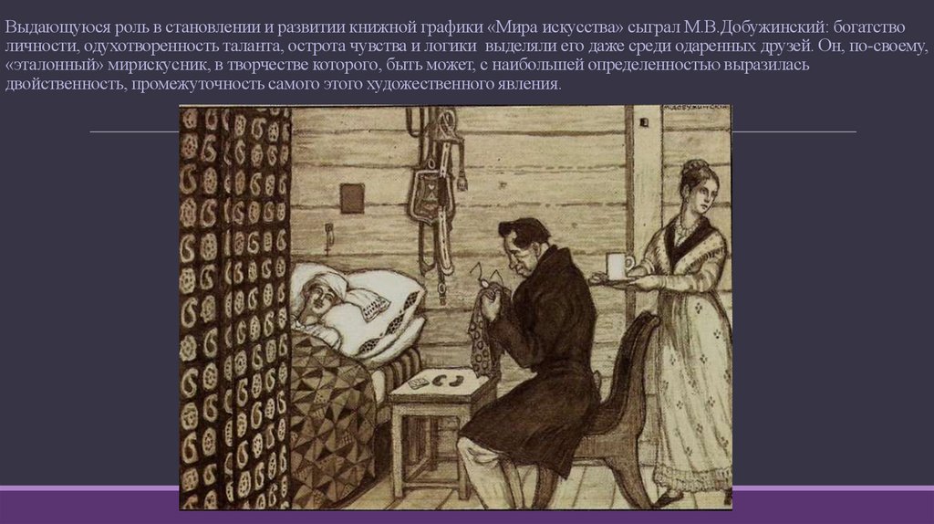 Выдающуюся роль в становлении и развитии книжной графики «Мира искусства» сыграл М.В.Добужинский: богатстволичности, одухотворенность таланта, острота чувства и логики выделяли его даже среди одаренных друзей. Он, по-своему,