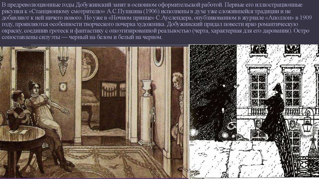 В предреволюционные годы Добужинский занят в основном оформительской работой. Первые его иллюстрационныерисунки к «Станционному смотрителю» А.С.Пушкина (1906) исполнены в духе уже сложившейся традиции и не