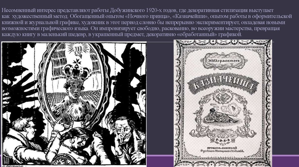 Несомненный интерес представляют работы Добужинского 1920-х годов, где декоративная стилизация выступаеткак художественный метод. Обогащенный опытом «Ночного принца», «Казначейши», опытом работы в оформительской