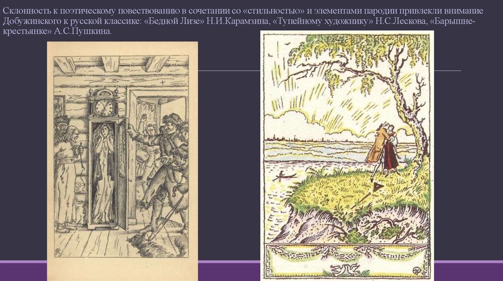 Склонность к поэтическому повествованию в сочетании со «стильностью» и элементами пародии привлекли вниманиеДобужинского к русской классике: «Бедной Лизе» Н.И.Карамзина, «Тупейному художнику» Н.С.Лескова, «Барышнекрестьянке» А.С.Пушкина.
