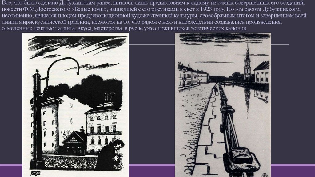 Все, что было сделано Добужинским ранее, явилось лишь предисловием к одному из самых совершенных его созданий,повести Ф.М.Достоевского «Белые ночи», вышедшей с его рисунками в свет в 1923 году. Но эта работа Добужинского,