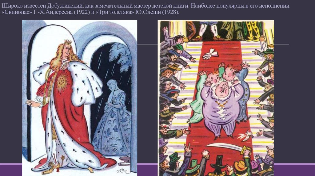 Широко известен Добужинский, как замечательный мастер детской книги. Наиболее популярны в его исполнении«Свинопас» Г.-Х.Андерсена (1922) и «Три толстяка» Ю.Олеши (1928).
