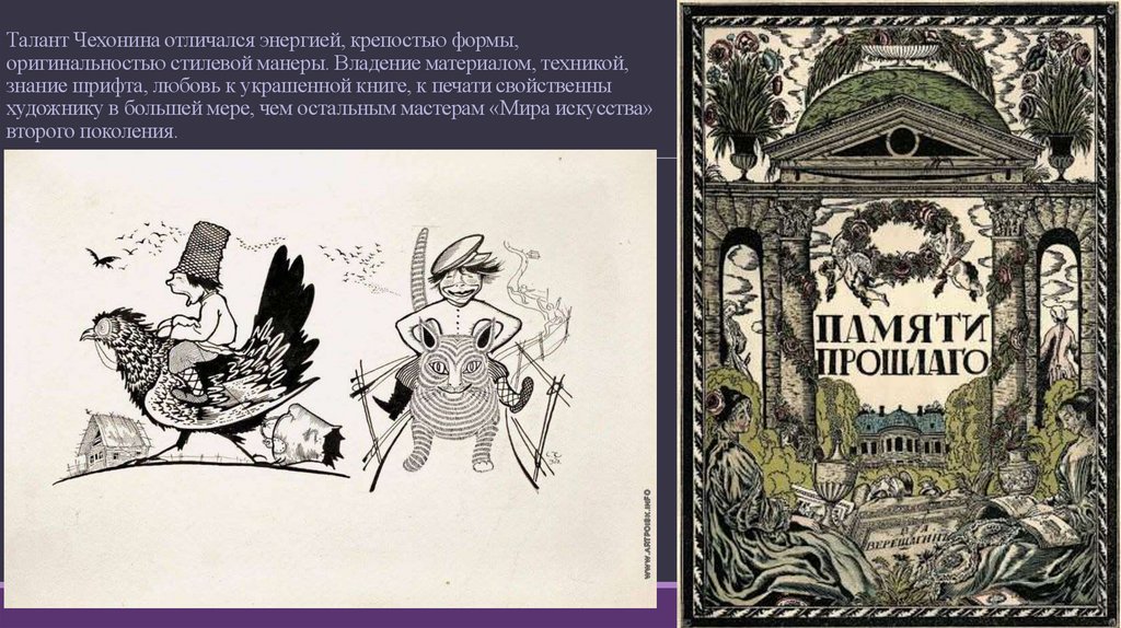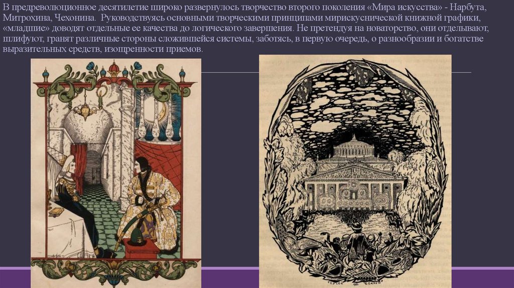 В предреволюционное десятилетие широко развернулось творчество второго поколения «Мира искусства» - Нарбута,Митрохина, Чехонина. Руководствуясь основными творческими принципами мирискуснической книжной графики,
