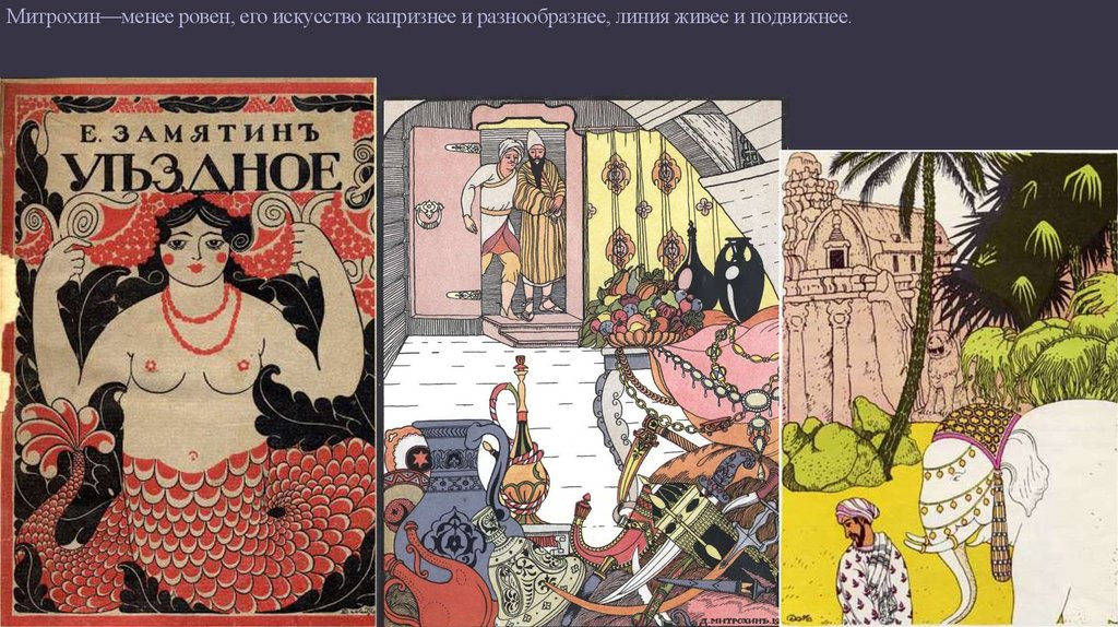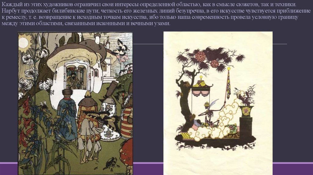 Каждый из этих художников ограничил свои интересы определенной областью, как в смысле сюжетов, так и техники.Нарбут продолжает билибинские пути; четкость его железных линий безупречна, в его искусстве чувствуется приближение