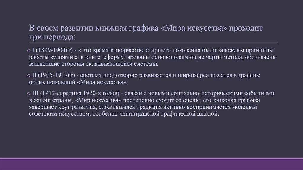 В своем развитии книжная графика «Мира искусства» проходиттри периода: