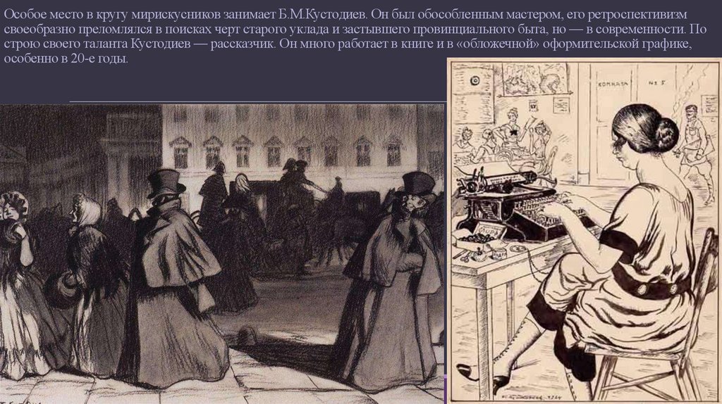 Особое место в кругу мирискусников занимает Б.М.Кустодиев. Он был обособленным мастером, его ретроспективизмсвоеобразно преломлялся в поисках черт старого уклада и застывшего провинциального быта, но — в современности. По