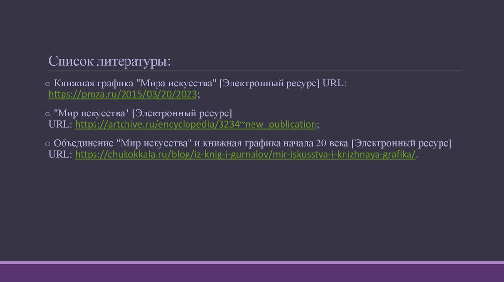 Список литературы:o Книжная графика "Мира искусства" [Электронный ресурс] URL: