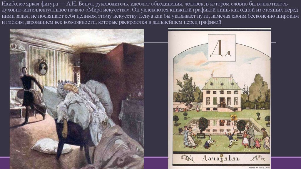 Наиболее яркая фигура — А.Н. Бенуа, руководитель, идеолог объединения, человек, в котором словно бы воплотилосьдуховно-интеллектуальное начало «Мира искусства». Он увлекаются книжной графикой лишь как одной из стоящих перед