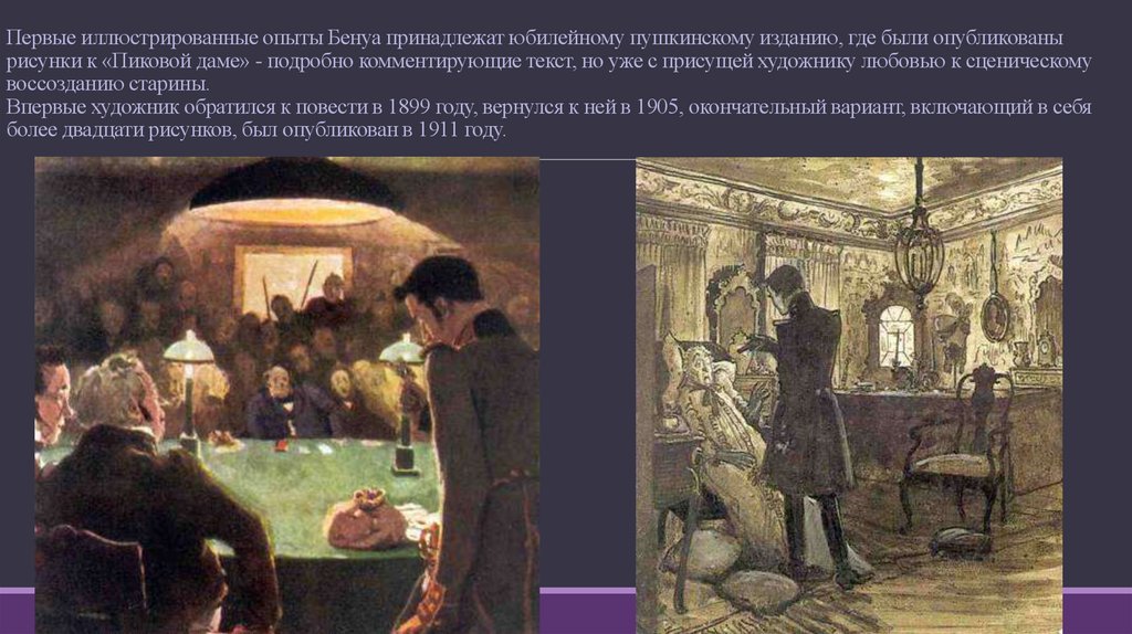 Первые иллюстрированные опыты Бенуа принадлежат юбилейному пушкинскому изданию, где были опубликованырисунки к «Пиковой даме» - подробно комментирующие текст, но уже с присущей художнику любовью к сценическому