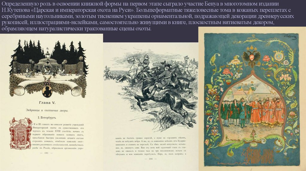 Определенную роль в освоении книжной формы на первом этапе сыграло участие Бенуа в многотомном изданииН.Кутепова «Царская и императорская охота на Руси». Большеформатные тяжеловесные тома в кожаных переплетах с
