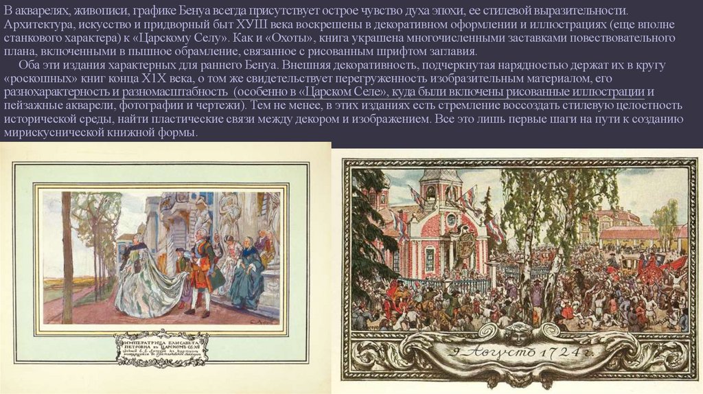 В акварелях, живописи, графике Бенуа всегда присутствует острое чувство духа эпохи, ее стилевой выразительности.Архитектура, искусство и придворный быт ХУШ века воскрешены в декоративном оформлении и иллюстрациях (еще вполне