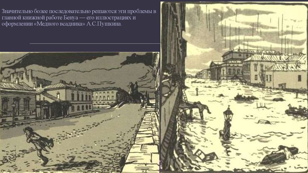 Значительно более последовательно решаются эти проблемы вглавной книжной работе Бенуа — его иллюстрациях и
