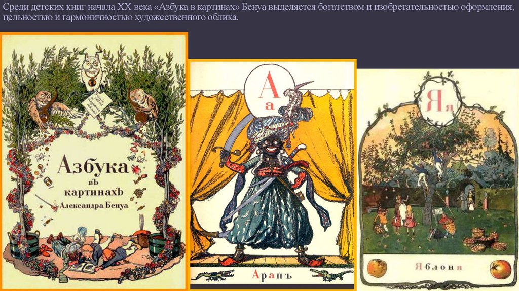 Среди детских книг начала ХХ века «Азбука в картинах» Бенуа выделяется богатством и изобретательностью оформления,цельностью и гармоничностью художественного облика.