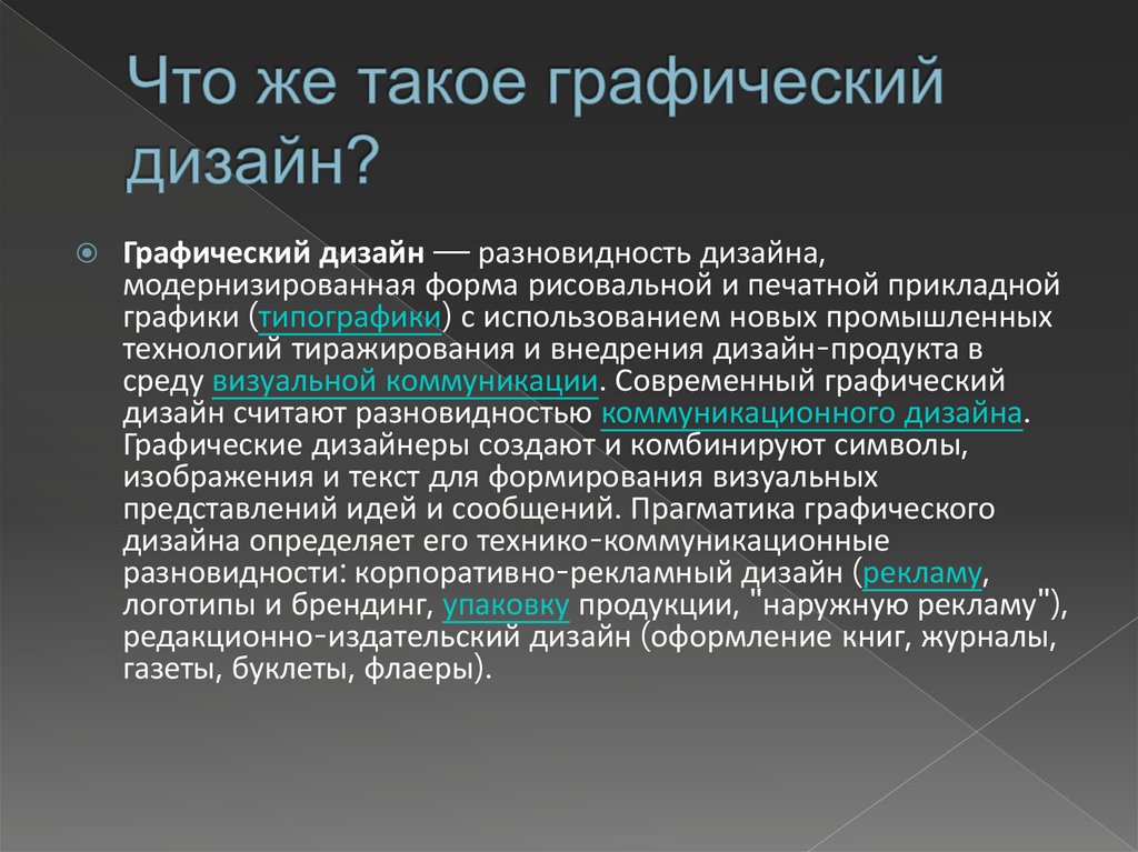 Графический дизайн — разновидность дизайна,модернизированная форма рисовальной и печатной прикладной