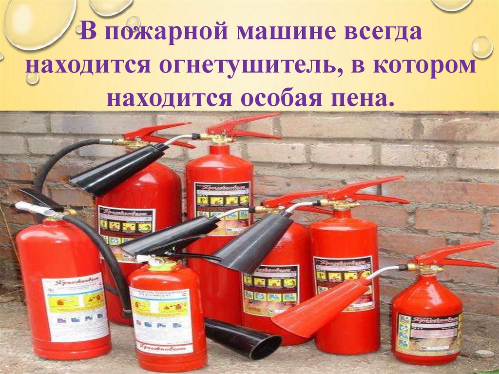В пожарной машине всегданаходится огнетушитель, в котором