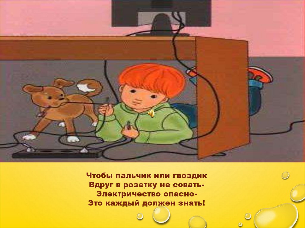 Чтобы пальчик или гвоздикВдруг в розетку не соватьЭлектричество опасноЭто каждый должен знать!