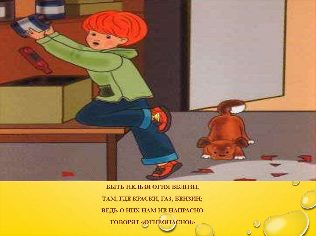 БЫТЬ НЕЛЬЗЯ ОГНЯ ВБЛИЗИ,ТАМ, ГДЕ КРАСКИ, ГАЗ, БЕНЗИН;