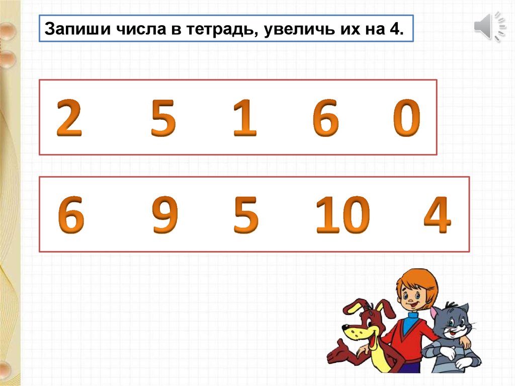 Запиши числа в тетрадь, увеличь их на 4.4.
