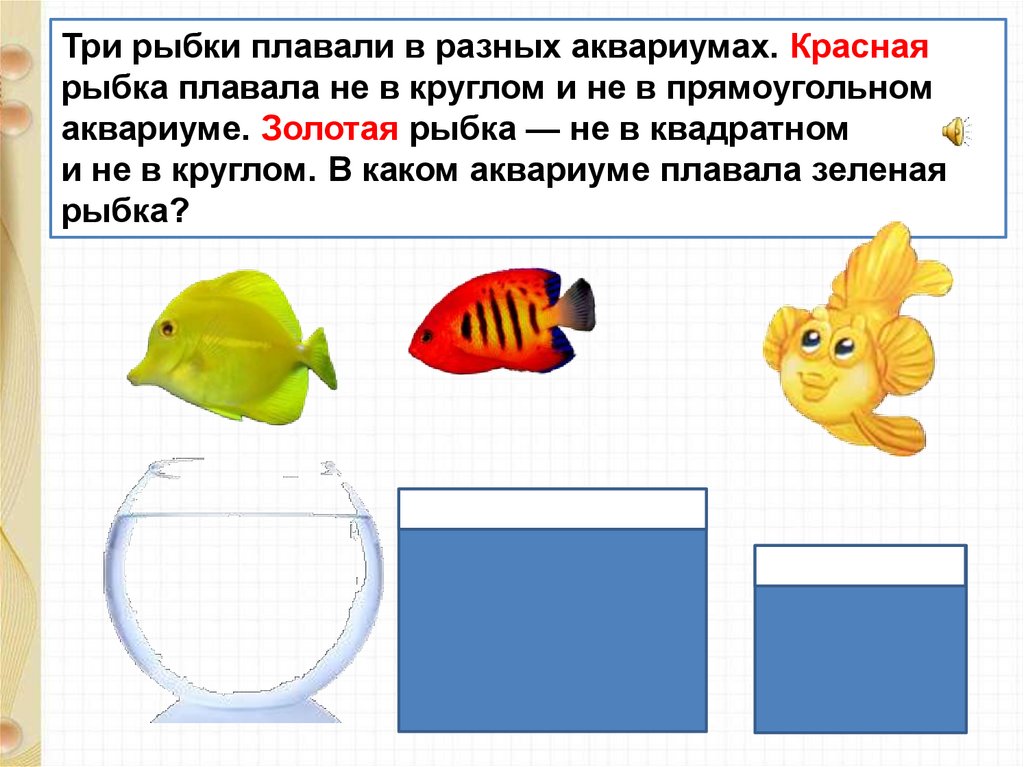 Три рыбки плавали в разных аквариумах. Краснаярыбка плавала не в круглом и не в прямоугольном