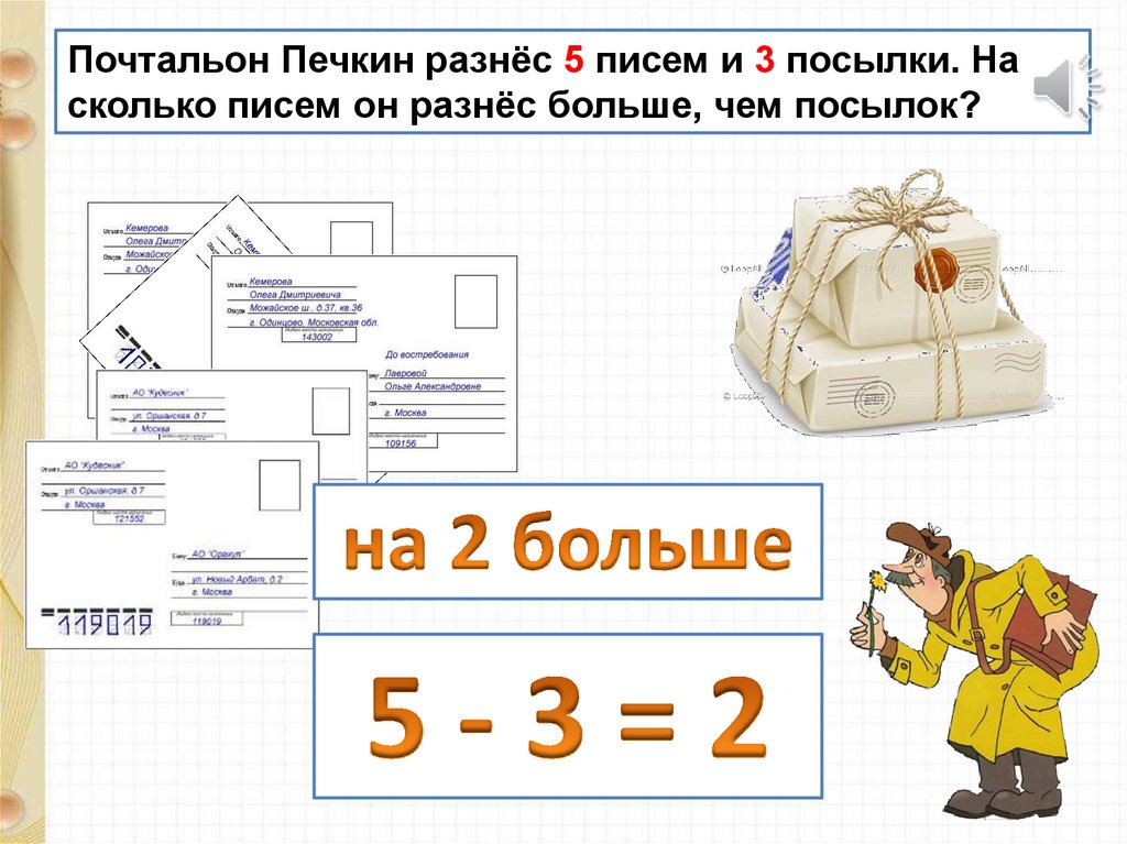Почтальон Печкин разнёс 5 писем и 3 посылки. Насколько писем он разнёс больше, чем посылок?