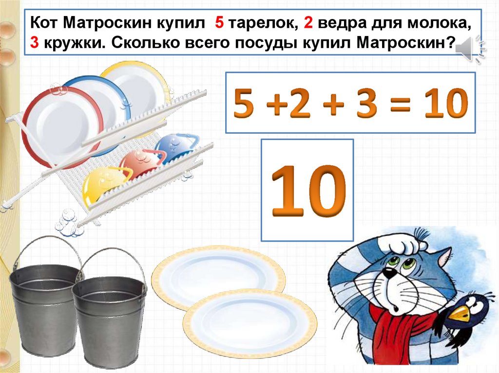 Кот Матроскин купил 5 тарелок, 2 ведра для молока,3 кружки. Сколько всего посуды купил Матроскин?
