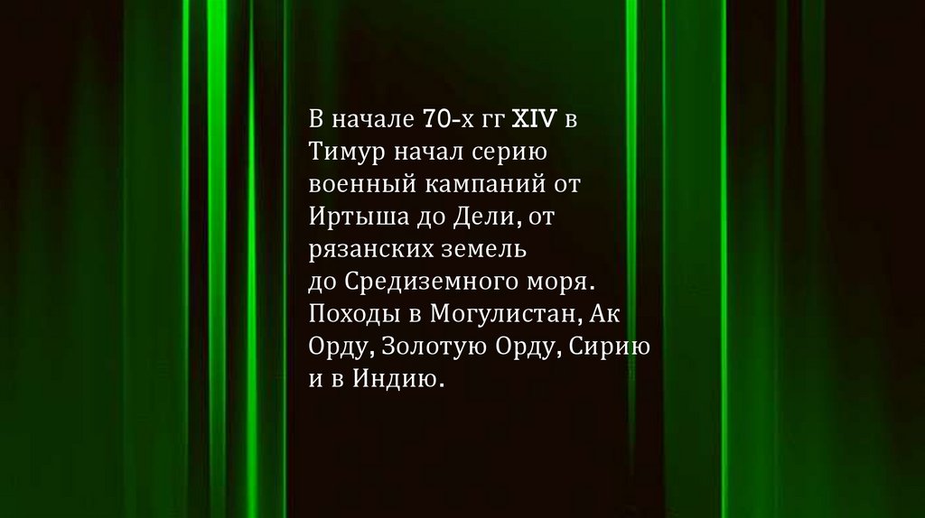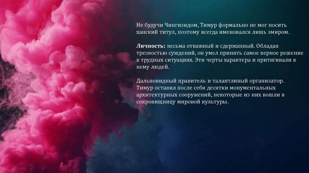 Не будучи Чингизидом, Тимур формально не мог носитьханский титул, поэтому всегда именовался лишь эмиром.