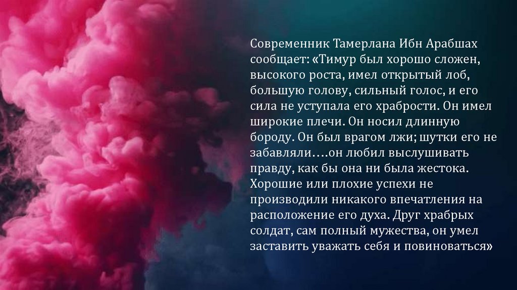 Современник Тамерлана Ибн Арабшахсообщает: «Тимур был хорошо сложен,