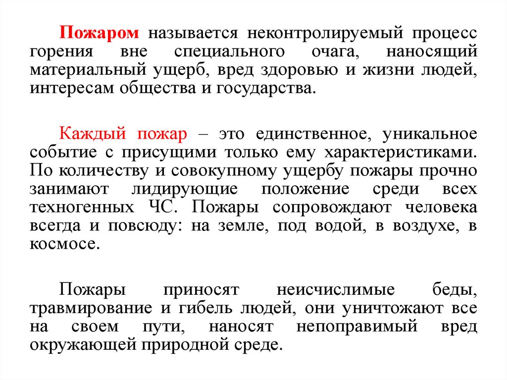 Пожаром называется неконтролируемый процессгорения вне специального очага, наносящий