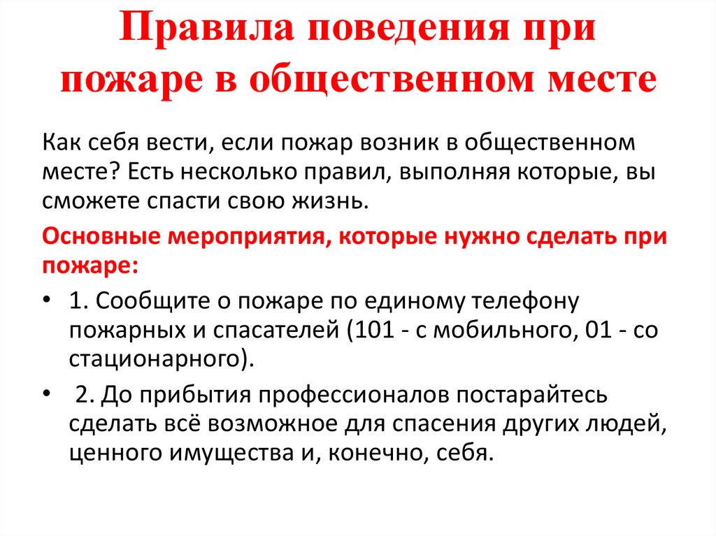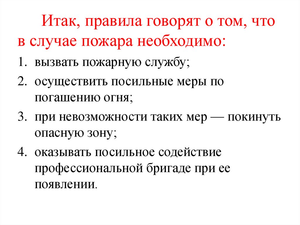 Итак, правила говорят о том, чтов случае пожара необходимо: