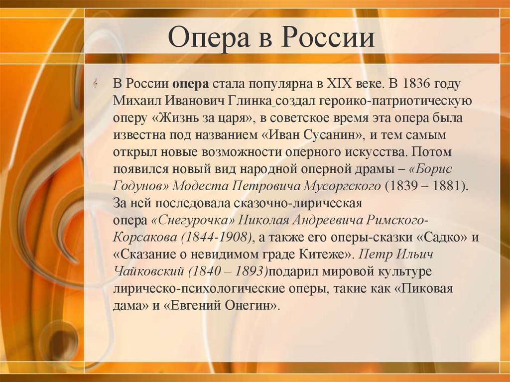 Опера в РоссииВ России опера стала популярна в XIX веке. В 1836 году