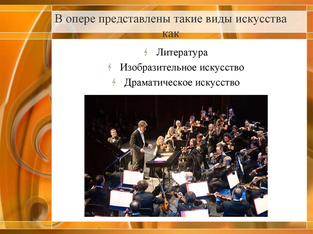 В опере представлены такие виды искусствакак