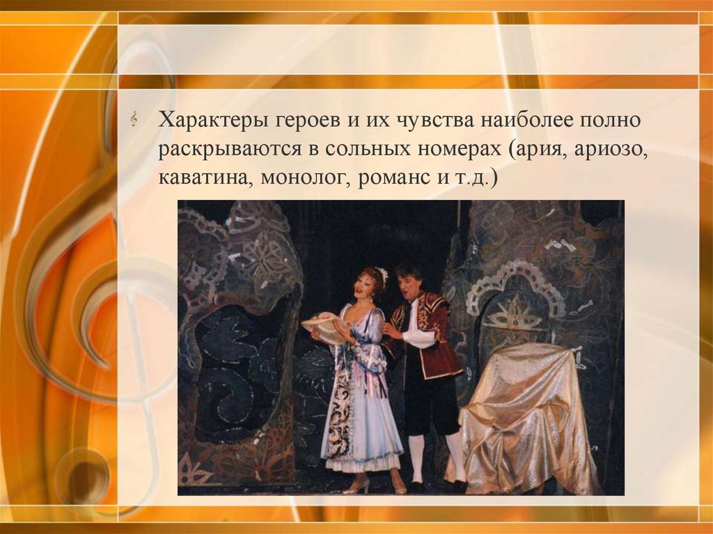 Характеры героев и их чувства наиболее полнораскрываются в сольных номерах (ария, ариозо,