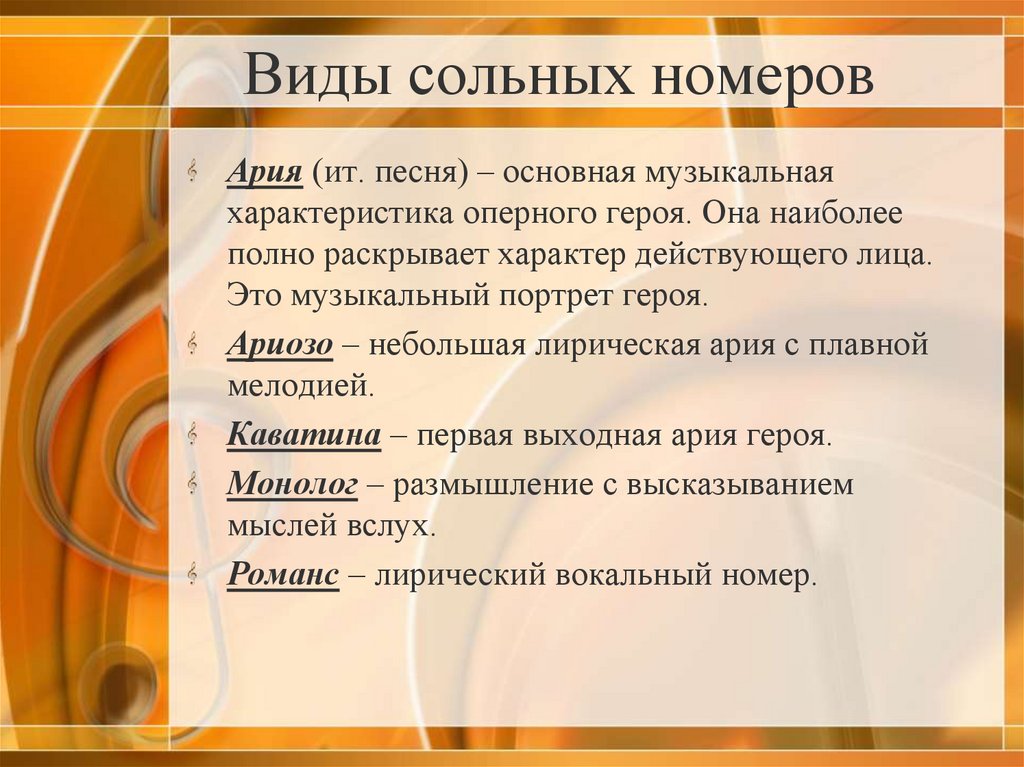 Виды сольных номеровАрия (ит. песня) – основная музыкальная