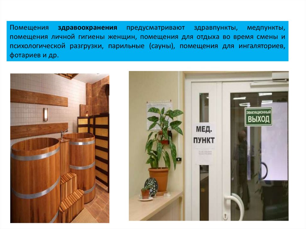 Помещения здравоохранения предусматривают здравпункты, медпункты,помещения личной гигиены женщин, помещения для отдыха во время смены и