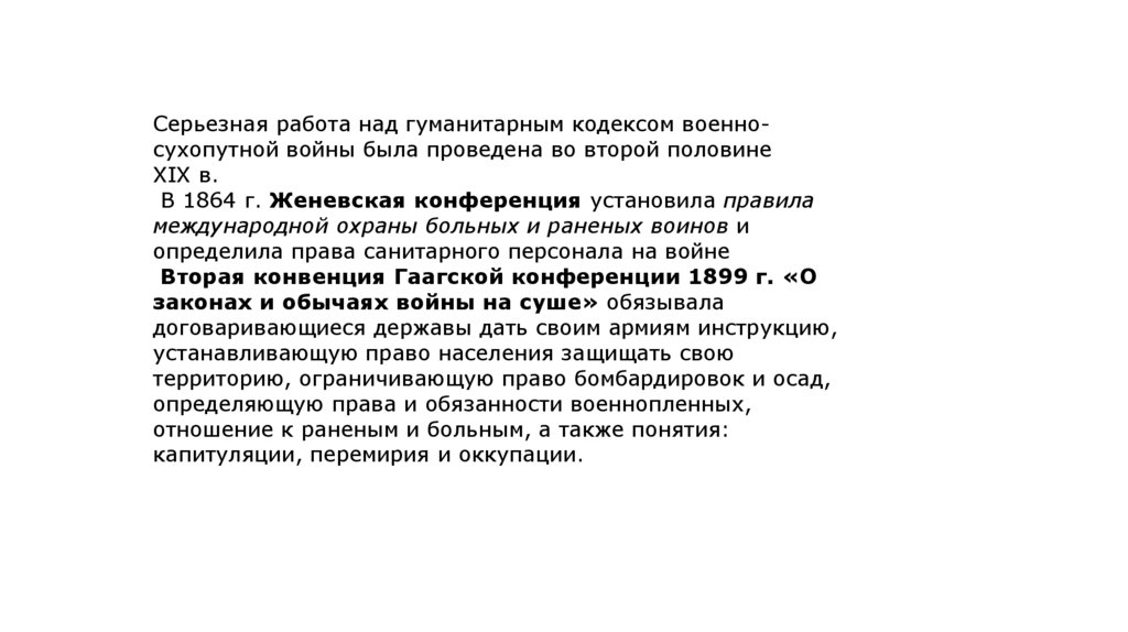 Серьезная работа над гуманитарным кодексом военносухопутной войны была проведена во второй половинеXIX в.
