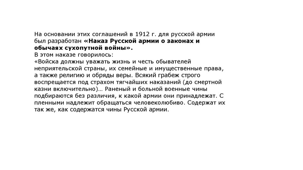 На основании этих соглашений в 1912 г. для русской армиибыл разработан «Наказ Русской армии о законах и