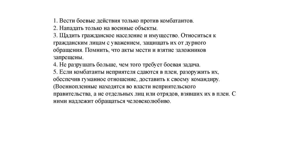 1. Вести боевые действия только против комбатантов.2. Нападать только на военные объекты.