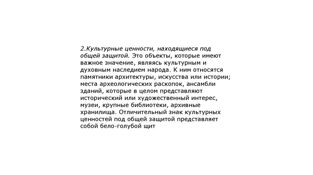 2.Культурные ценности, находящиеся подобщей защитой. Это объекты, которые имеют