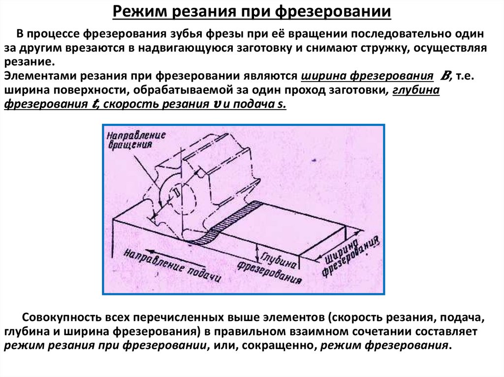 Режим резания при фрезерованииВ процессе фрезерования зубья фрезы при её вращении последовательно один