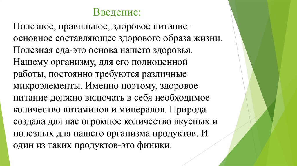 Введение:Полезное, правильное, здоровое питаниеосновное составляющее здорового образа жизни.