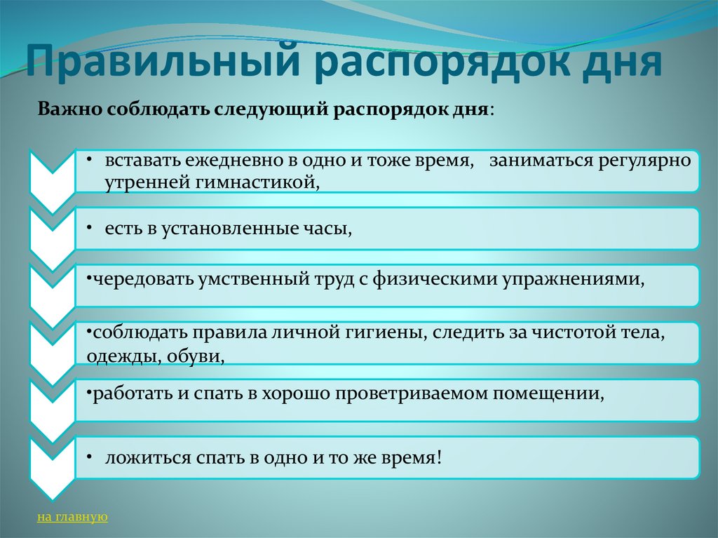 Правильный распорядок дняВажно соблюдать следующий распорядок дня:
