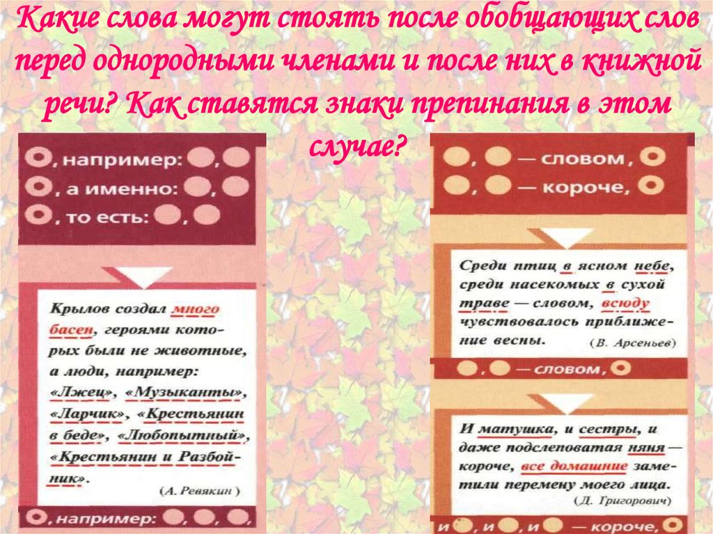 Какие слова могут стоять после обобщающих словперед однородными членами и после них в книжной