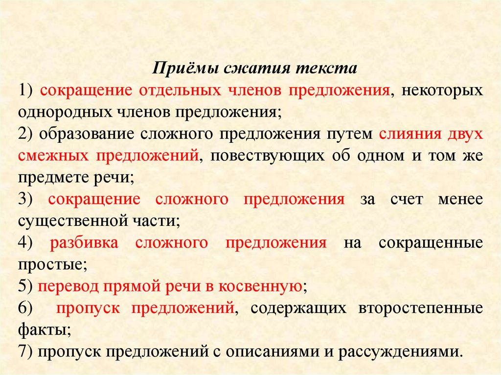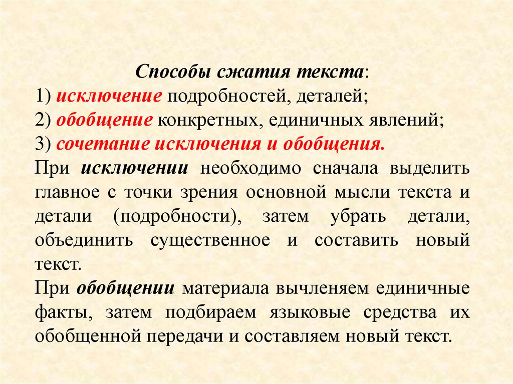 Способы сжатия текста:1) исключение подробностей, деталей;
