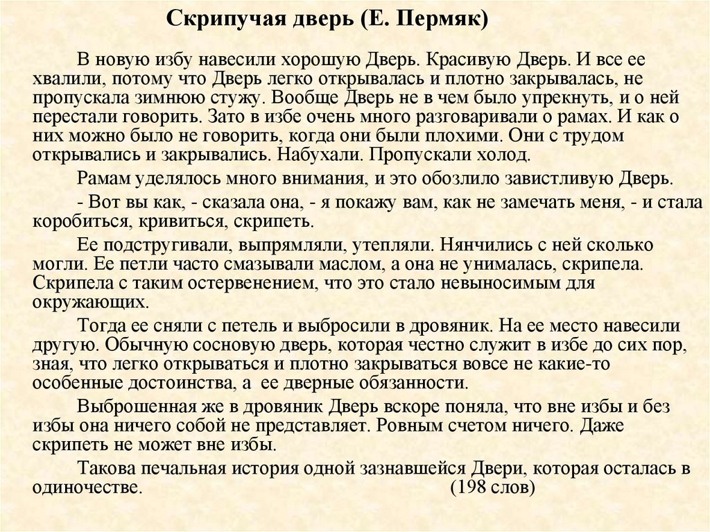 Скрипучая дверь (Е. Пермяк)В новую избу навесили хорошую Дверь. Красивую Дверь. И все ее