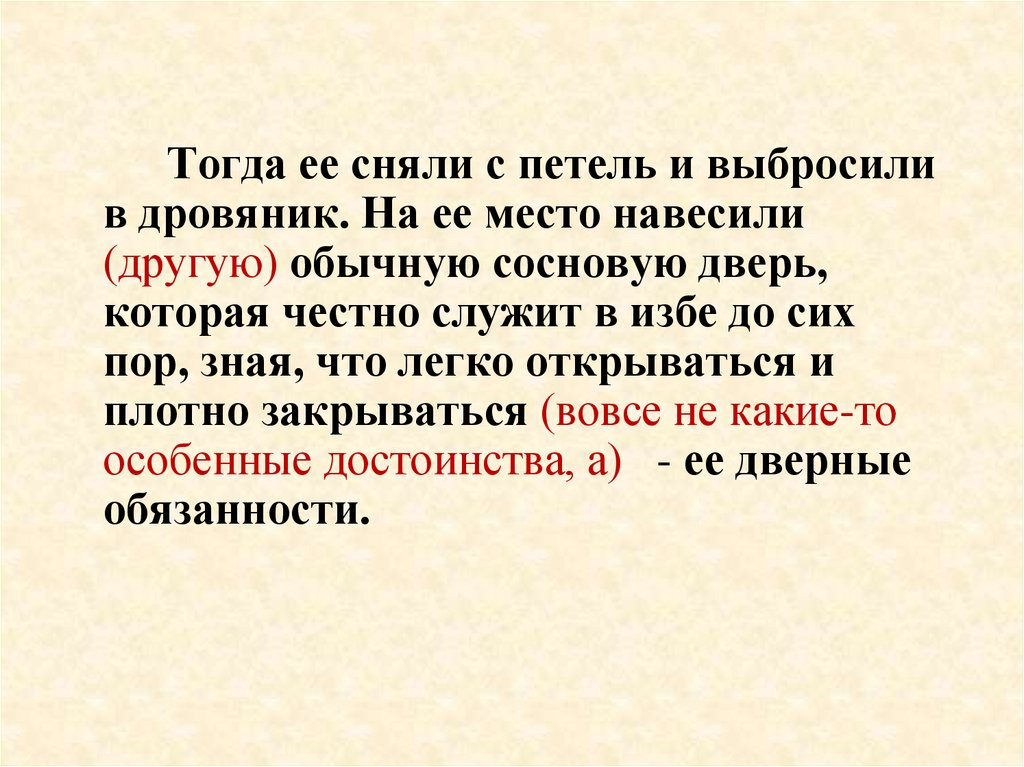 особенные достоинства, а ее дверные обязанности.